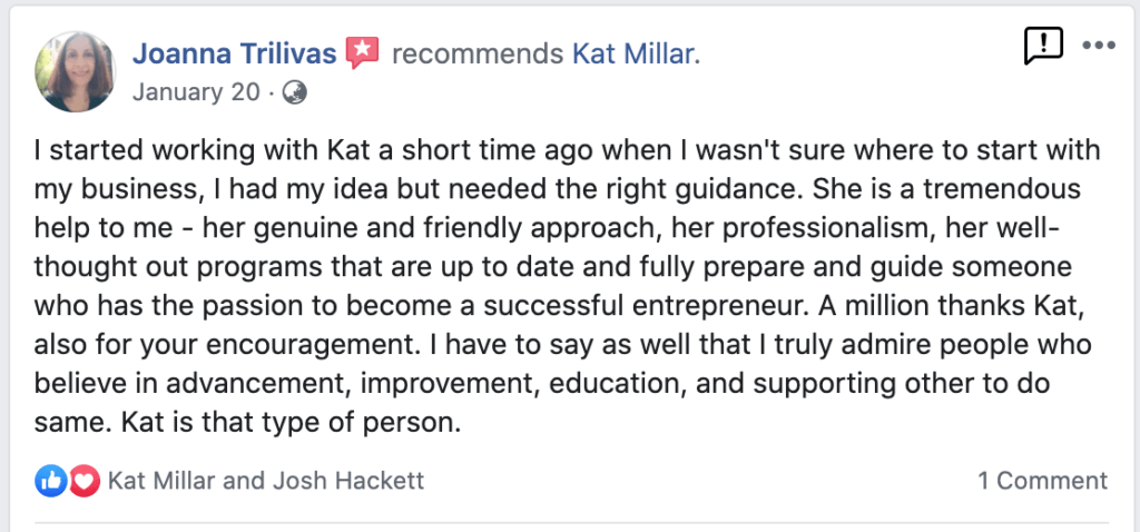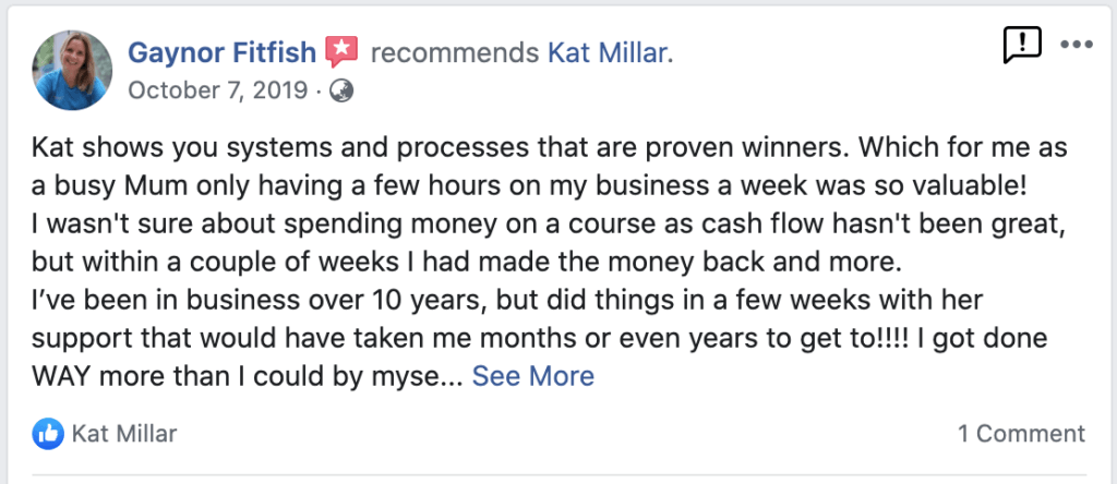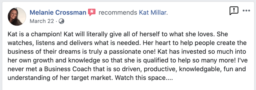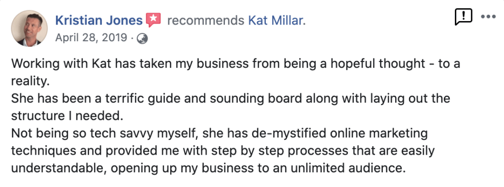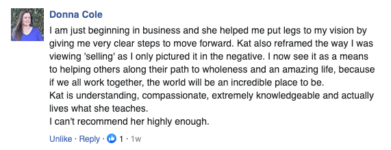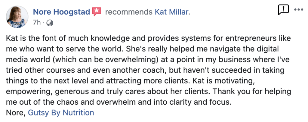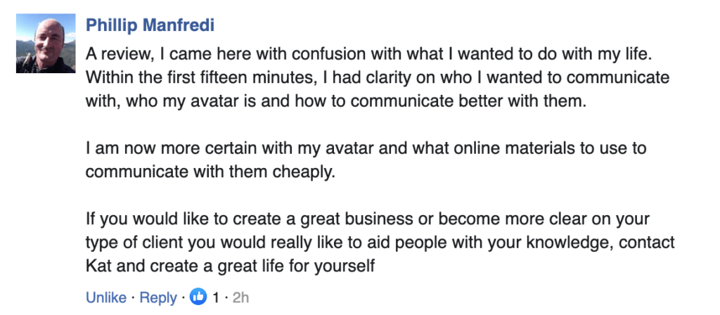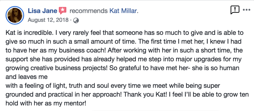 “Kat gives you practical, easy to implement strategies that you can implement immediately. If you need help getting your business running efficiently and attracting the right customers, then Kat’s program is right for you. No gimmicks or shortcuts, just real, heart centered advice!” – David Beer, Owner: Life Transformed Coaching “