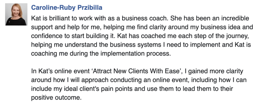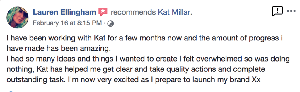 “I chose to work with Kat to grow my business because I was overwhelmed and didn’t know which steps to take. I was suffering from paralysis by analysis! Kat gives me the support I was lacking. I’m accountable to someone and as a result, more productive than I’ve ever been. Thank you Kat I’m thoroughly enjoying working with you” – Simone Wood, Owner: The Phoenix Tribe