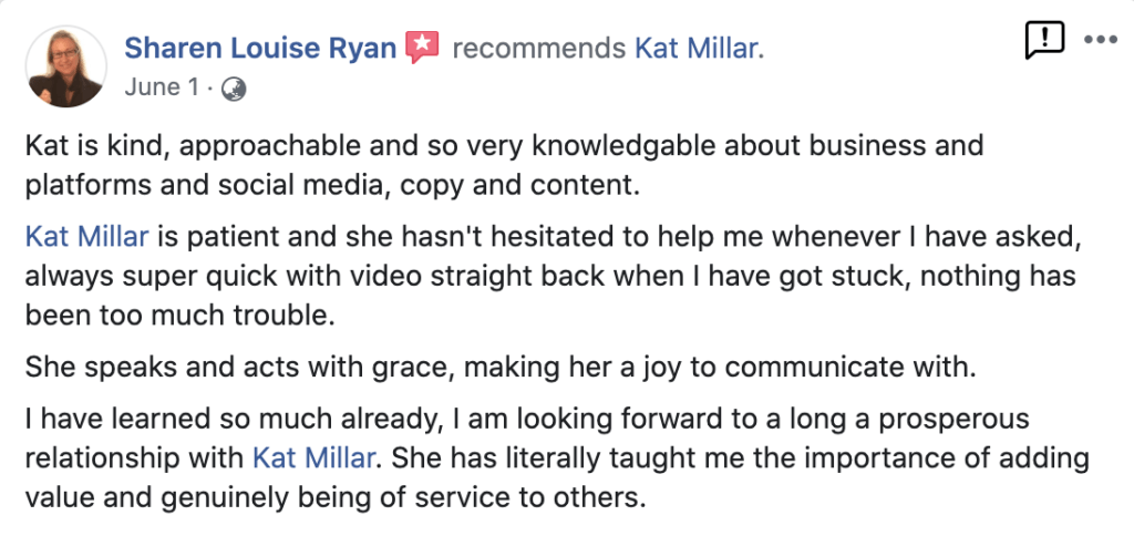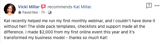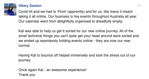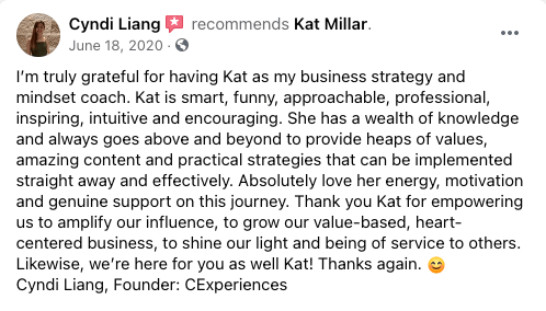 “Kat has been like a lifeline to my business. I’ve attended many workshops with her and brought friends along. She has accelerated my skills in the latest digital marketing tools and helped me overcome my procrastination to launch my first event campaign. She has in-depth knowledge about what works and what doesn’t. What I like about Kat is that her advice is really practical and of immediate use to move me forward when I’m stuck in on a campaign. Together, she would edit my adverts to the exact words that appeal to clients.” - Linh McDermott