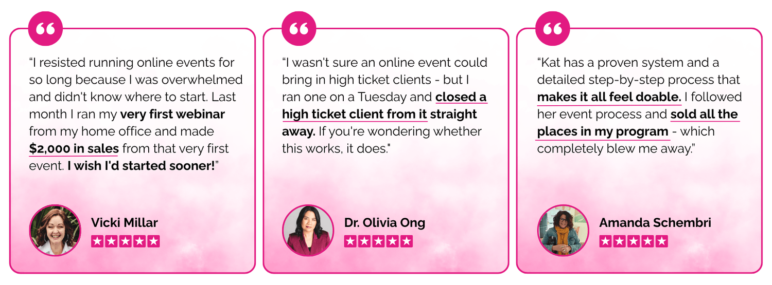 The tools and strategies you'll get are the same ones women are using right now to sign clients consistently from simple online events.
